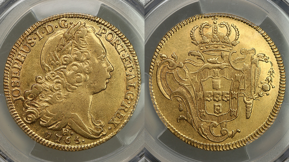 Бразилия. Хосе I. 6400 рейс 1765 года. В слабе PCGS AU55