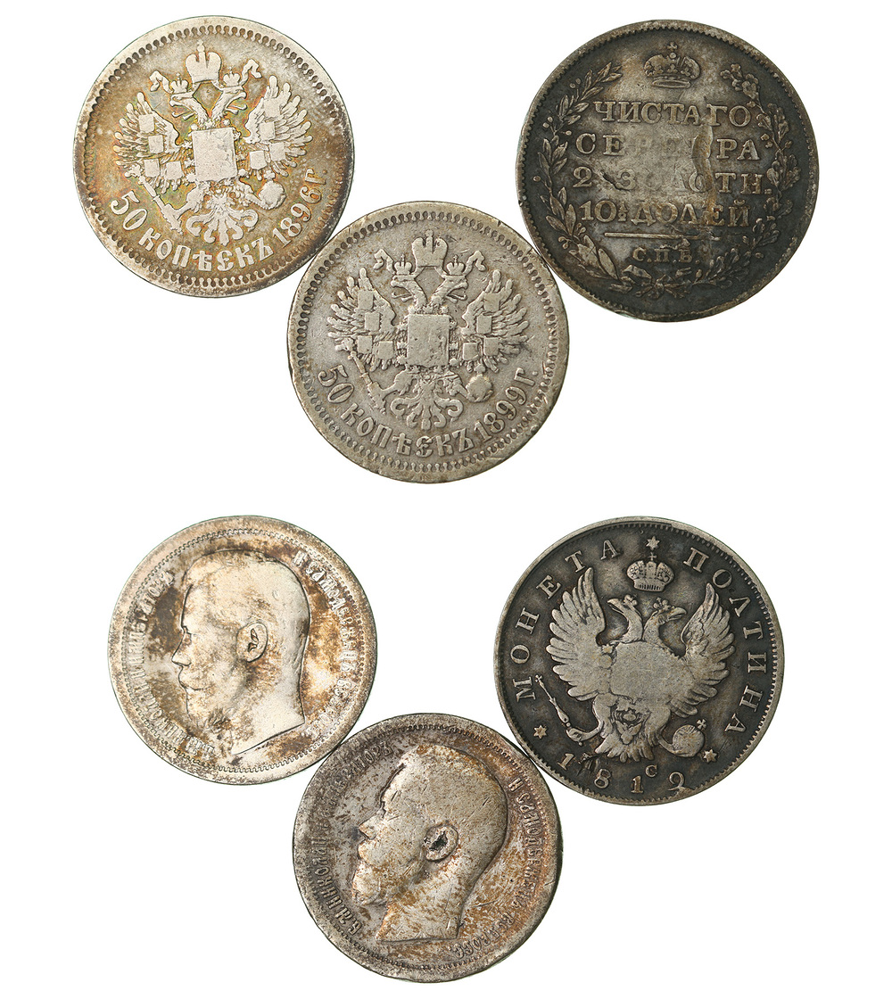 Полтина 1819 года; 50 копеек 1896 года, гурт АГ; 50 копеек 1899 года, гурт *.