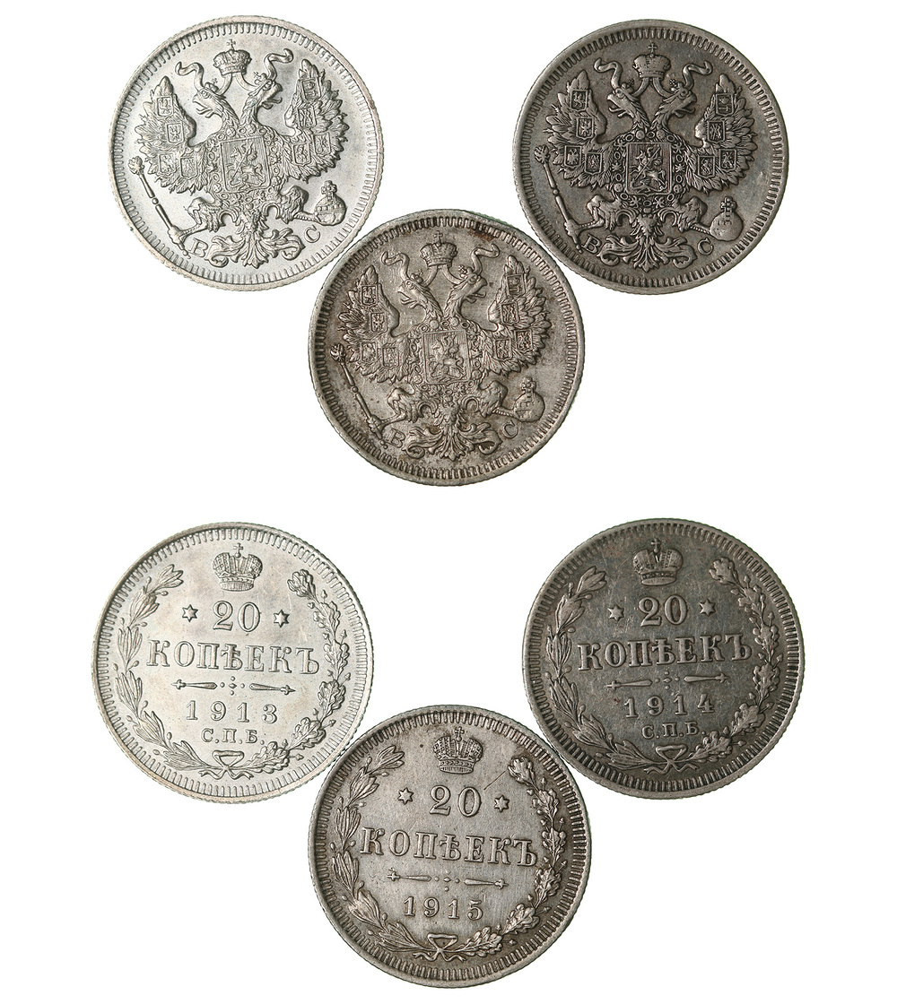 Серебро. 20 копеек 1913 года; 20 копеек 1914 года; 20 копеек 1915 года.