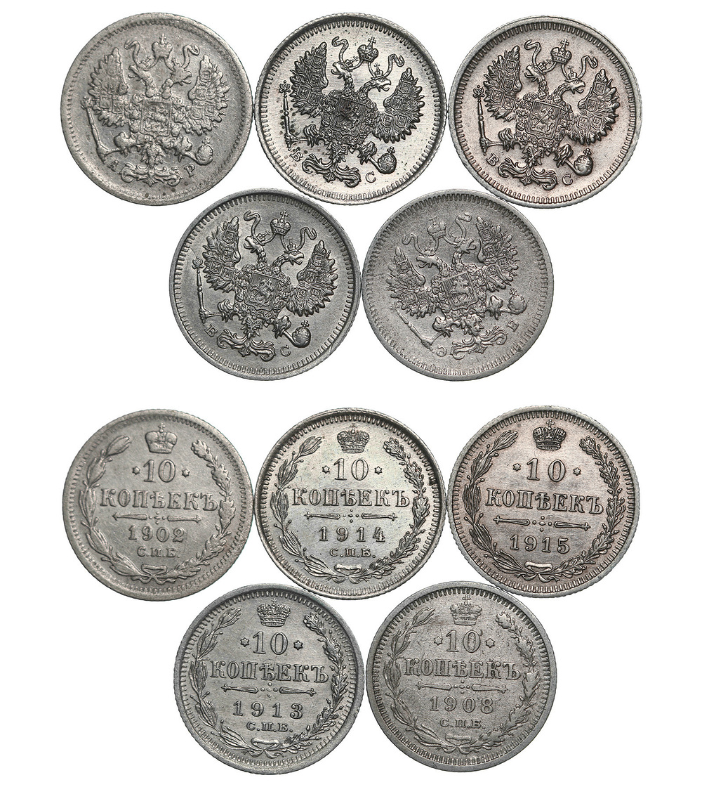 10 копеек 1902 года; 10 копеек 1908 года; 10 копеек 1913 года; 10 копеек 1914 года; 10 копеек 1915 года.