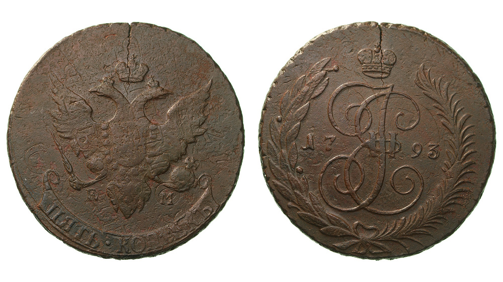 Россия. 5 копеек 1793 года. ЕМ. Павловский перечекан. (1797 г.)