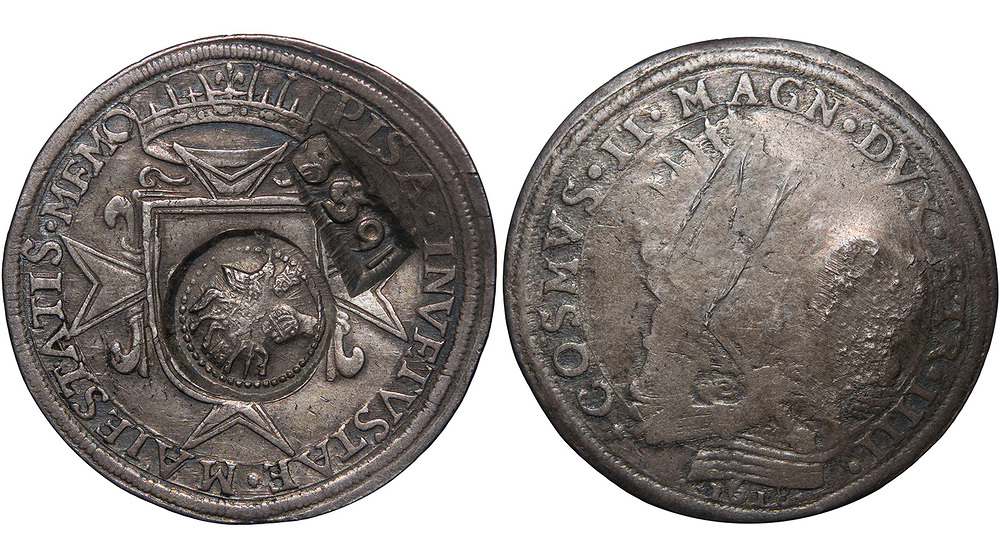С двумя российскими надчеканами 1655 г. времени денежной реформы царя Алексея Михайловича. Старый Московский денежный двор. Серебро, 28,12 г. Спасский #1498 (собрание Эрмитажа). Davenport #4195 (аналог талера). Сохранность талера отличная, прекрасный прочекан клейм, красивая патина. Крайне редкий и важный ефимок. В частных руках известно всего лишь несколько надчеканенных итальянских талеров. С экспертным заключением Центра исследований культурных ценностей. Отлично прочеканенные клейма времени Алексея Михайловича изрядно «потрепали» герб знаменитого рода Медичи на талере – шесть «родовых» шаров напрочь исчезли с поля геральдического щита, их заслонила деловито шествующая конная фигура «копейного» русского царя. Также сильные удары русского молота по штемпелю с клеймом низвели поясное изображение герцога Тосканы на другой стороне талера до состояния «ушёл в небытие», что и бронь доспехов не спасла. Однако фигура тосканского герцога Козимо II заслуживает того, чтобы о нём рассказали подробнее… Немного предыстории. Богатая и независимая Флорентийская республика, основанная в Северной Италии ещё в XII веке на демократических началах, в 1530 году была завоёвана Карлом V Габсбургом (1520-1556), императором Священной Римской империи. В 1532 году триумфатор «развеял республиканский дух» с занятой территории: с его помощью возникла новая монархическая единица – Флорентийское герцогство. Первый правитель, Алессандро Медичи, был настолько плох, что уже через три года к Карлу V прибыла делегация знатных флорентийцев с просьбой лишить герцога его титула. Император отказал. Правда, спустя 2 года опостылевший правитель был убит своим же родственником. В 1537 году, после убийства Алессандро, герцогом стал 17-летний представитель младшей ветви семьи, Козимо I Медичи (1519-1574). Волевой, проницательный и амбициозный юноша с помощью инквизиции уничтожал противников, забирая их имущество, и обложил подданных тяжёлым налоговым бременем. Справедливости ради отметим, герцог был важным покровителем искусств. Такие титаны, как Джорджо Вазари и Бенвенуто Челлини пользовались его поддержкой. Но власть – прежде всего! На собранные (вернее, «выбитые») с подданных деньги Козимо I создал флот и завоевал основного конкурента Флоренции в Средней Италии – Сиенскую республику. Недурно раздвинув границы «сеньории» и достаточно укрепив власть, Козимо I приобрёл у Ватикана более громкий титул. 27 августа 1569 года папской буллой он был возведён в ранг великого герцога Тосканского. А 5 марта 1570 года в Риме при участии самого Папы Пия V состоялась коронация Козимо I Медичи. Началась история Великого герцогства Тосканского… Представленный на аукционе талеро, послуживший основой для «ефимка», отчеканен во время правления внука первого великого герцога Тосканы. Названный в честь деда – Козимо, он появился на свет 12 мая 1590 года. А приняв титул в 1609 году, вошёл в историю как Козимо II Медичи. Осторожный политик постоянно лавировал между грозными соседями: Испанией и Францией. Отметим, именно Козимо II лично способствовал заключению брака французского короля Людовика XIII с Анной Австрийской (Д’Артаньян, мушкетёры, подвески). Благодаря его разумной и стабильной политике Тоскана вступила в период экономического процветания. Но всё-таки больше всего Козимо II остался известен как покровител