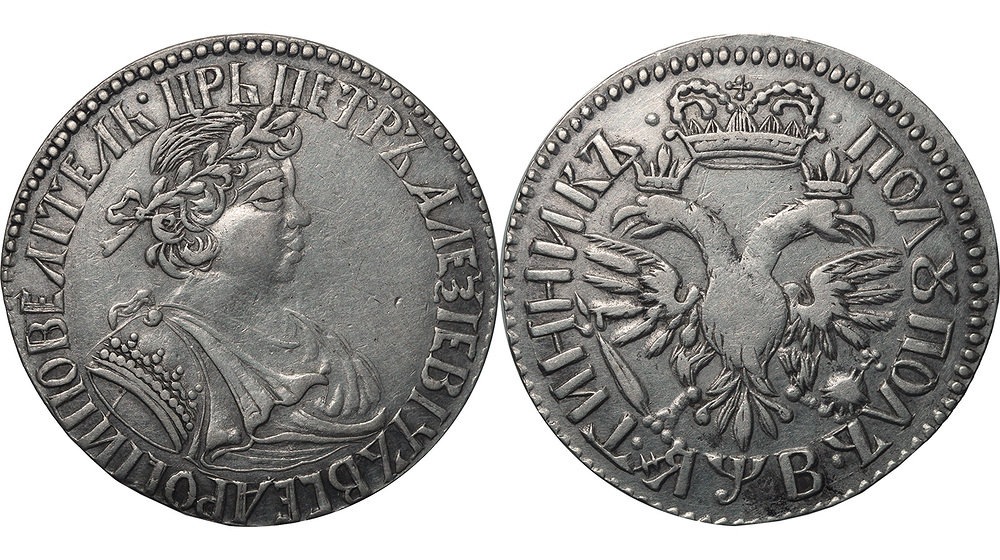 Кадашевский монетный двор. Малая голова, лавровый венок с лентами. Дата «ЯФВ» между точек. Гурт гладкий. Серебро, 7,0 г. Дьяков (ЗС) #43 (R2). Биткин #700 (R2). Уздеников #0446 (черта с точкой). ГМ #7.5 (довольно редкая). 25 рублей по Петрову. Сохранность отличная. Очень редкая и важная ранняя монета. Начальный период чеканки монет европейского типа характеризуется поиском образа портрета царя и герба и, естественно, большим разнообразием штемпелей, которые резались вручную. В отличии от других, довольно аляповатых изображений на полуполтинниках 1701 - 1702 гг., данный портрет молодого Петра и гербовой орёл вышли удачнее. Штемпель аверса данной монеты принадлежит, по всей видимости, руке Юрия Фробоса – именитого ювелира и эмальера, мастера Оружейной палаты (работал там с 1669 по 1700 гг., в 1701 г. поступил на службу на Кадашевский монетный двор). Штемпель реверса изготовил не менее известный человек – Иван Посошков – выдающийся экономист, публицист и денежный мастер петровского времени. У обоих мастеров прослеживается характерная стилистика изображений и декоративных элементов, характерный набор шрифтов (см. Г.В. Просвиров. Нумизматика #47. 2012). С экспертным заключением Центра исследований культурных ценностей.