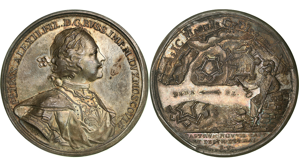 Санкт-Петербургский монетный двор, последняя треть XVIII века. Из серии медалей на события Северной войны. Медальер Т. Иванов (в обрезе рукава на аверсе «T.I.»). Серебро, 51,33 г. Диаметр 47 мм. Дьяков #17.6 (R1). Соколов #078.е.К (R2). Великие Русские победы в медали и гравюре #221-223. Иверсен #XIV.c. Смирнов #166. Сохранность превосходная, красивая патина. Справа от портрета на аверсе старинная пометка орешковыми чернилами: «6» с точкой внизу. История взятия шведской крепости Ниеншанц, недалеко от устья Невы, довольно примечательна. 25 апреля 1703 года русская армия под командованием генерал-фельдмаршала Б. П. Шереметева подошла к крепости и осадила её. На следующий день к армии прибыл лично государь со свитой. Пётр I, по своему обыкновению, произвёл личную разведку крепости… Наконец, к 30 апреля были построены батареи, вооружённые 19 пушками и 13 мортирами. В полдень того же дня фельдмаршал Шереметев послал шведскому коменданту предложение о сдаче, но получил отказ. Тогда в 19:00 со всех батарей по Ниеншанцу был открыт огонь. Из мортир стреляли всю ночь. Шведский гарнизон сначала энергично отвечал, но вдруг от удачного попадания русского снаряда в пороховой погреб крепости сдетонировали боеприпасы… Мощным взрывом заодно был уничтожен боевой дух немногочисленного гарнизона: к 5-ти утра огонь со шведской стороны затих, и вскоре донёсся барабанный сигнал о готовности к капитуляции… Ниеншанц был взят без боя. Нева от истока до устья перешла под русский контроль. Также открылся путь к Финскому заливу. Ниеншанц был переименован в Шлотбург (Замок-город).