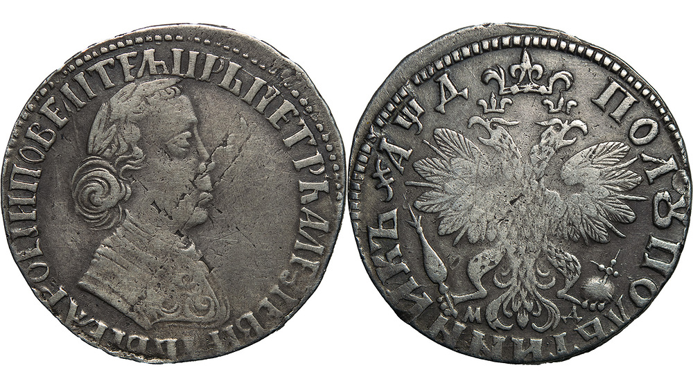 Кадашевский монетный двор. Портрет с «узким бюстом», рукав закрытый. «МД» под лапами орла, крест державы украшен. Гурт гладкий. Серебро, 7,31 г. Дьяков (ЗС) #122 (R1). Биткин #710 (R1). Уздеников #0470 (черта). ГМ #14.12. 4 рубля по Петрову. Сохранность очень хорошая, приятная патина, слоение металла на аверсе.