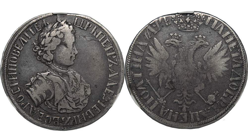 Кадашевский монетный двор. Портрет высокого рельефа. Большая корона открытая. Гурт гладкий. Серебро. Дьяков (ЗС) #206 (R3). Биткин #557 (R3). Уздеников #0490 (черта с двумя точками). ГМ #19.10 (редкая). 75 рублей по Петрову. Монета в слабе CPRC, VF20. Красивая патина. Очень редкая и важная монета. «Уборные» полтины – одни из наиболее красивых и желанных среди петровских полтин, относятся к группе классических типовых редкостей. Своё название этот тип полтин получил из-за украшенных лат – царь изображён в богато украшенном одеянии (уборе). Вариант портрета в высоком рельефе встречается особенно редко. По уровню исполнения аверса и реверса монеты видна рука опытного мастера европейского уровня. В данном случае, по манере исполнения и деталям портрета, безошибочно угадывается работа Готфрида Гаупта. Как раз саксонский медальер поступил на российскую службу в 1705 году. Работая на Московском монетном дворе, резал штемпеля медалей и монет 1705 - 1710 гг.