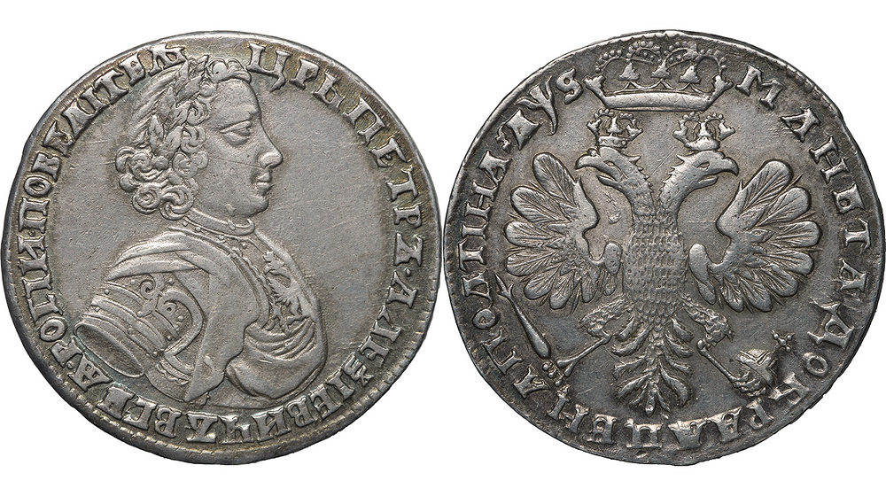 Кадашевский монетный двор. Голова малая, бюст широкий. Крест державы малый. Гурт гладкий. Серебро, 14,35 г. Дьяков (ЗС) #221 (R1). Биткин #562 (R1). Уздеников #0500 (точка). ГМ #24.10. 6 рублей по Петрову. Сохранность отличная, приятная лёгкая патина. Редкая типовая полтина. Отличный прочекан, выразительный портрет.