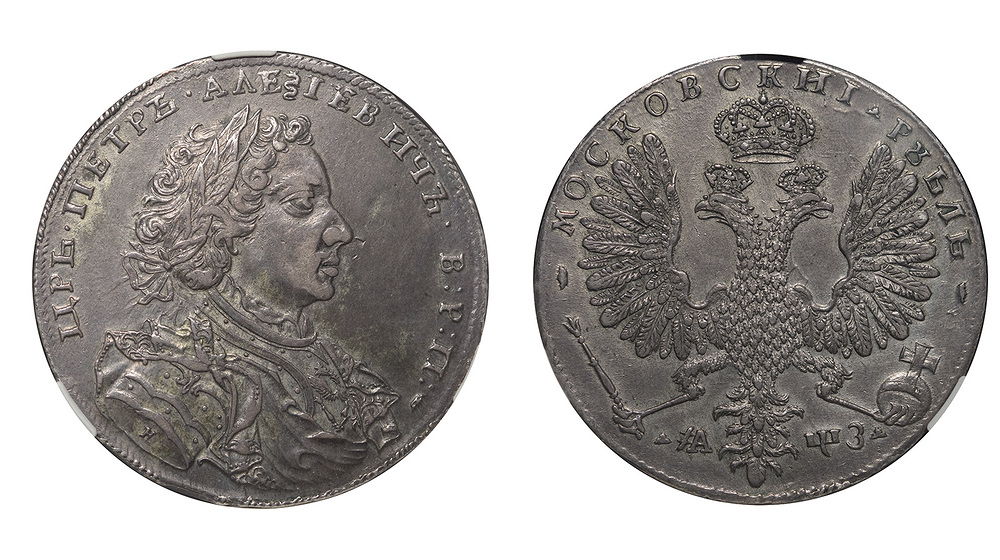 Кадашевский монетный двор. Портрет работы Готфрида Гаупта. В обрезе рукава «Н», венок с лентой. Дата славянскими буквами. Гурт гладкий. Серебро. Дьяков (ЗС) #232 (R1). Биткин #184. Уздеников #0506 (черта). ГМ #30.3. 10 рублей по Петрову. Монета в слабе CPRC, AU58*. Редкая и важная монета в великолепном состоянии. Прекрасный прочекан мельчайших деталей и сохранность полей, красивая густая патина. Удивительной красоты экземпляр! Монета из коллекции Леонида Содерманна, с аукциона Sincona №24. Цюрих, 14 октября 2015 года, лот 37.