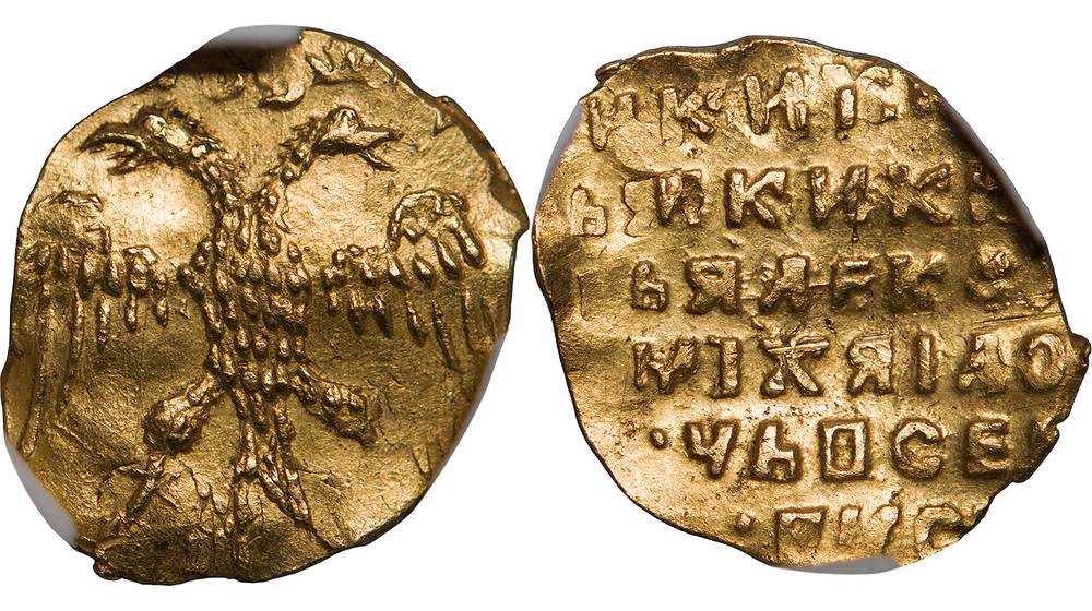 Старый Московский денежный двор. Золото, 0,82 г. Спасский (Русские государственные награды 1654 г. для войска Богдана Хмельницкого. Эрмитаж, 2013) стр.183 #1-8 (по типу). Биткин (медали) #68.В (R2). Монета в слабе CPRC, MS61. «Тогож 1654 року в среду в пост Спасов было слонца затмение о полдне… А Хмелницкий з войском Козацким и в Московским ему приданым, для осторожности Украины от поляков, стоял тогда обозом под Хвастовом, где неякийсь от Царского Величества посланий значний персона прибывши, дал каждому козакове царского жалованя по червонному малому». Самоил Величко. Летопись событий в Юго-Западной России в XVII веке. Редкая важная наградная монета в превосходном состоянии. Из всех русских монет впервые дата арабскими цифрами была обозначена именно на золотых 1654 года. С экспертным заключением Центра исследований культурных ценностей.