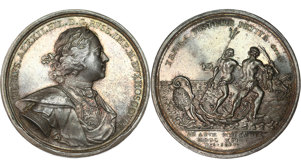 Санкт-Петербургский монетный двор, последняя треть XVIII века. Из серии медалей на события Северной войны. Медальер Т. Иванов (в обрезе рукава на аверсе «T.I.»). Серебро, 52,08 г. Диаметр 47,5 мм. Дьяков #44.5 (R1). Соколов #096.ж.К (R2). Великие Русские победы в медали и гравюре #409-411. Иверсен #XL.c. Смирнов #198. Сохранность превосходная, глянцевые поля, красивая патина.