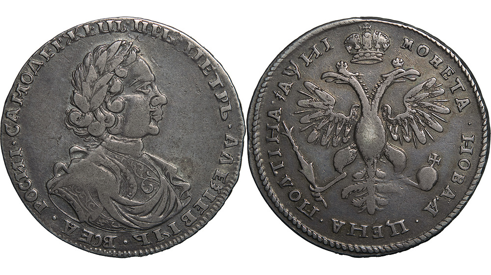 Красный монетный двор. Портрет в латах, без пряжки на плаще, без знака медальера, с арабесками на груди. Инициалы минцмейстера «L» на хвосте орла, «ПОЛТIНА». Гурт надпись. Серебро, 13,84 г. Дьяков (ЗС) #568 (R1). Биткин #1005 (R). Уздеников #0562. ГМ #92.13. 5 рублей по Петрову. Сохранность очень хорошая, красивая патина.
