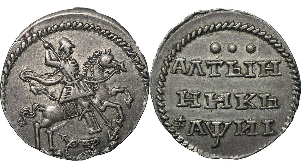 Красный монетный двор. Всадник в плаще, без инициалов минцмейстера на реверсе. Гурт гладкий. Серебро, 1,56 г. Дьяков (ЗС) #652 (R1). Биткин – нет. Уздеников #0571. ГМ – нет. 1,5 рубля по Петрову. Сохранность близкая к превосходной, красивая патина. Интересный номинал. Алтынники, ранее выпускавшиеся эпизодически, в 1718 чеканились в последний раз, но увеличенных объёмах, что связано с отказом от выпуска в этом году проволочной копейки.