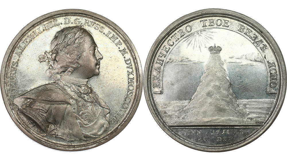 Санкт-Петербургский монетный двор, последняя треть XVIII века. На завершение процесса царевича Алексея. Аверс: медальер Т. Иванов (на аверсе, в обрезе рукава «T.I.», на реверсе, справа над обрезом, внутри изображения «T.I»). Серебро, 50,94 г. Диаметр 47 мм. Дьяков #54.9. Соколов #069.д.К. Великие Русские победы в медали и гравюре #71-73. Иверсен #IL.е. Смирнов #206. Сохранность превосходная, красивая патина. Скала, увенчанная короной, на реверсе помимо символа власти олицетворяет и самого Петра (по-гречески Пётр означает «камень»).