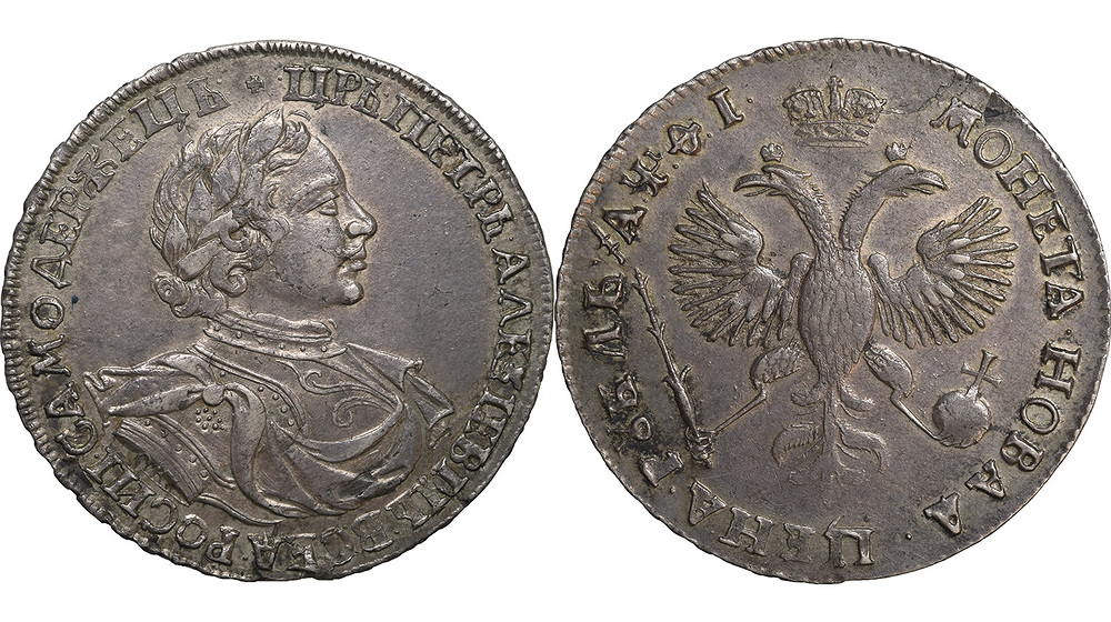 Красный монетный двор. Портрет в латах, «ОК» в обрезе рукава, пряжка на плаще, розетка из точек на плече, арабески на груди, крест над головой. Без инициалов минцмейстера, большой крест на державе, дата разделена точками. Гурт надпись, с датой: «1720». Серебро, 27,93 г. Дьяков (ЗС) #743 (R1). Биткин #831. Уздеников #0578 (точка). ГМ #102.6. 5 рублей по Петрову. Сохранность отличная, красивая патина.