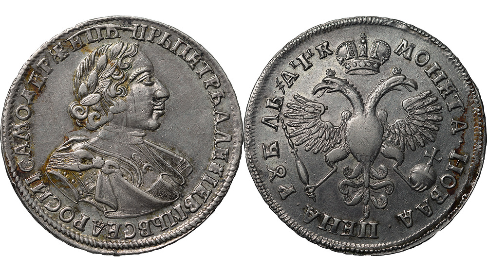 Кадашевский монетный двор. Портрет в латах, без инициалов медальера, арабески на груди, заклёпки на рукаве. Гурт надпись. Серебро, 28,39 г. Дьяков (ЗС) #932 (R1). Биткин #334. Уздеников #0588. 3 рубля по Петрову. Сохранность отличная, приятная лёгкая патина. Редкий вариант портрета. Характерная трещина штемпеля аверса в верхней части и следы его подчистки в области щеки и шее.