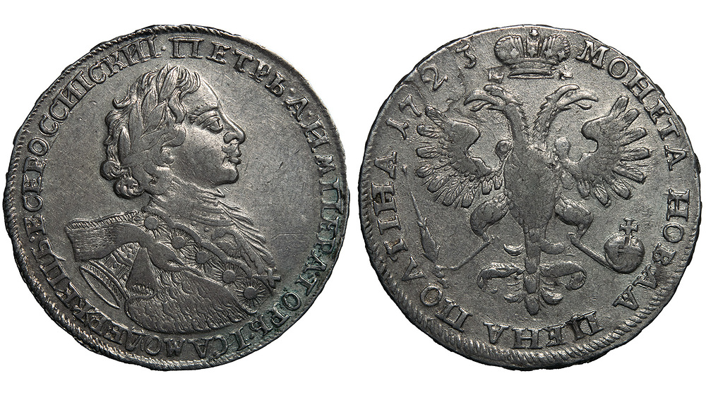 Полтина 1723 года. Бюст в горностаевой мантии.