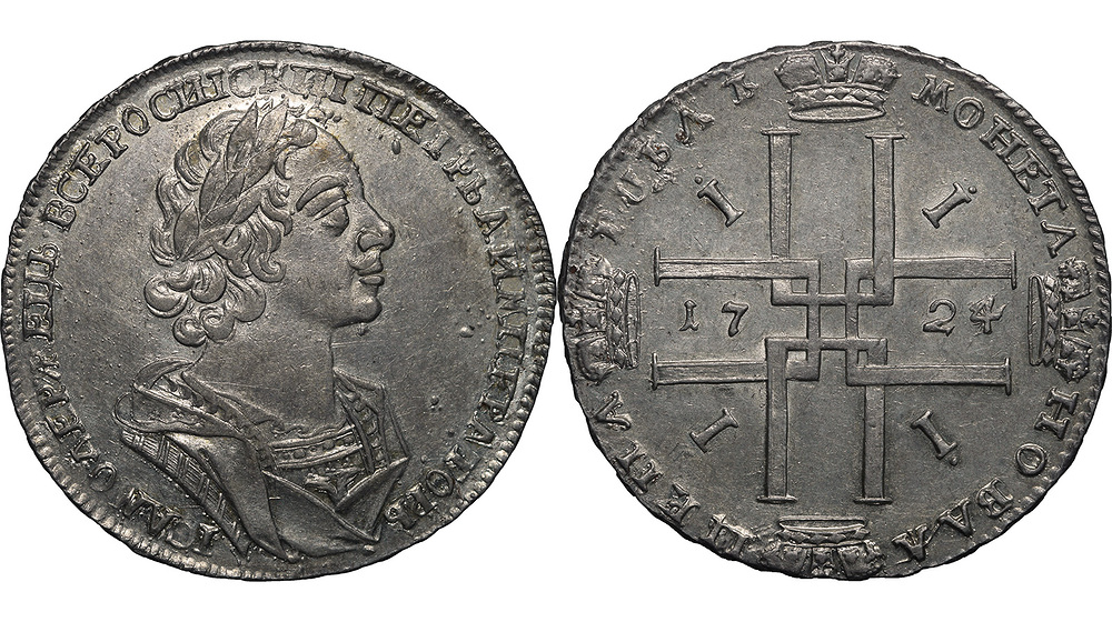 Красный монетный двор. Портрет в античном плаще, без инициалов медальера, лента на груди украшена узором из чередующихся символов: точка – овал. В перекрестьях монограммы i маленькие. Последняя цифра года набита пуансоном дважды. Гурт надпись. Серебро, 28,0 г. Дьяков (ЗС) #1477 (R2). Биткин #950 (реверс). Уздеников #0617. Сохранность превосходная, лёгкая патина, штемпельный блеск.