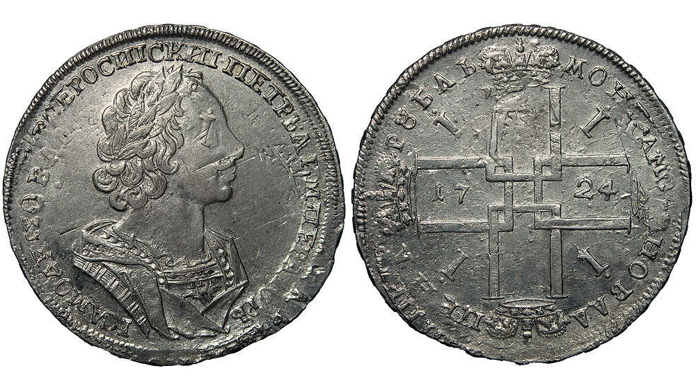 Кадашевский монетный двор. Портрет 1723 года, без инициалов медальера, лента на груди украшена ромбами, разделёнными точками (3 ромба, 2 точки). Цифры «2» и «4» даты сближены и с наклон6ом вправо. Гурт надпись. Серебро, 28,0 г. Дьяков (ЗС) #1484 (R1). Биткин – нет. Уздеников #0617. 3 рубля по Петрову. Сохранность отличная. Редчайший вид производственного брака. Бракованная монета (со смещением изображения относительно центра кружка) была подвергнута повторной чеканке. При этом кружок положили на нижний штемпель (аверса) оборотной стороной. В итоге получилось, что на месте глаза императора расположена «i» из вензельного перекрестья реверса, также отчётливо просматриваются контуры литеры «П» и короны вензеля перед лицом Петра I. Грубейший, недопустимый для крупного номинала брак. При строгих нравах того времени, «неподобающий» отпечаток на царственном лике могли расценить как чуть ли не «крамолу». Единичные экземпляры случайно остались по недосмотру, став теперь интереснейшими памятниками монетного дела того времени.