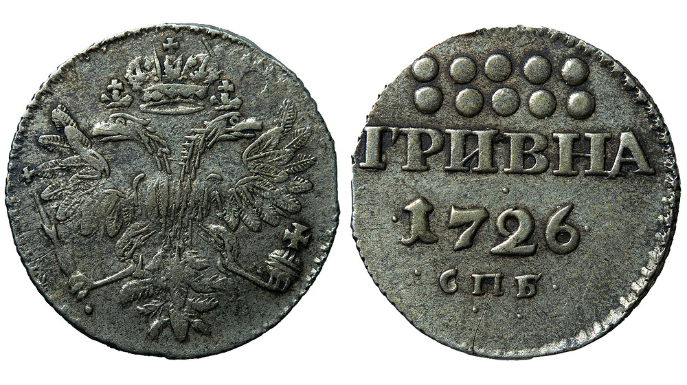Санкт-Петербургский монетный двор. Короны с крестами, центральная корона широкая, на вершине скипетра крест. Гурт шнуровидный. Серебро, 2,74 г. Петрунин #170. Дьяков #5, Биткин #233 (R1). Уздеников #0661 (черта с точкой). ГМ #13.19. 8 рублей по Ильину. 10 рублей по Петрову. Сохранность отличная. Редкая и интересная монета. Чеканка этих низкопробных монет велась по инициативе князя А.Д. Меншикова, сулила казне (и самому Меншикову) немалую прибыль, однако наносила вред экономике. Для того, чтобы придать добротный внешний вид монетам 42 (438) пробы в сплав «новой инвенции» стали добавлять мышьяк. Всего меншиковских гривенников успели выпустить на 40000 рублей, после чего, последовали указы об изъятии их из обращения.