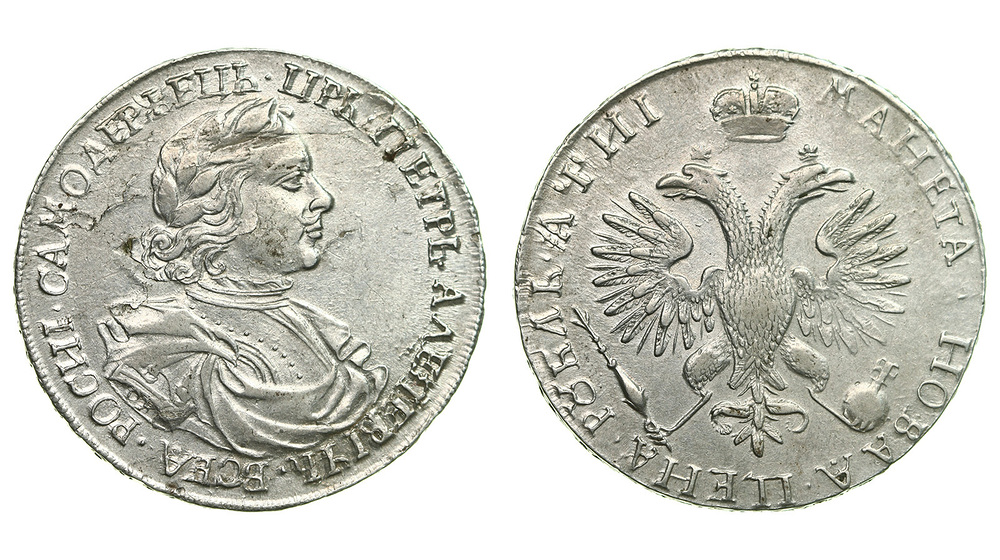 Редкая. Кадашевский монетный двор. Аверс: инициалы медальера "ОК", без арабесок на груди, без вышивки на рукаве. Реверс: "МАНЕТА". Гурт: "РУЕЛЬ". Биткин R, №204 стр.22, Уздеников №0556, Петров - 5 рублей.
