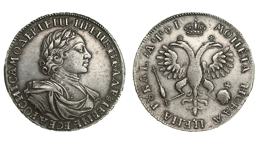 Редкая. Кадашевский монетный двор. Насыщенная светло-серая патина. Аверс: инициалы медальера "ОК" в рукаве, без пряжки на плаще, с вышивкой на рукаве, без арабесок на груди. Реверс: "L" на хвосте орла. Биткин R, №279, стр 32. Уздеников № 0576. Петров - 5 рублей.