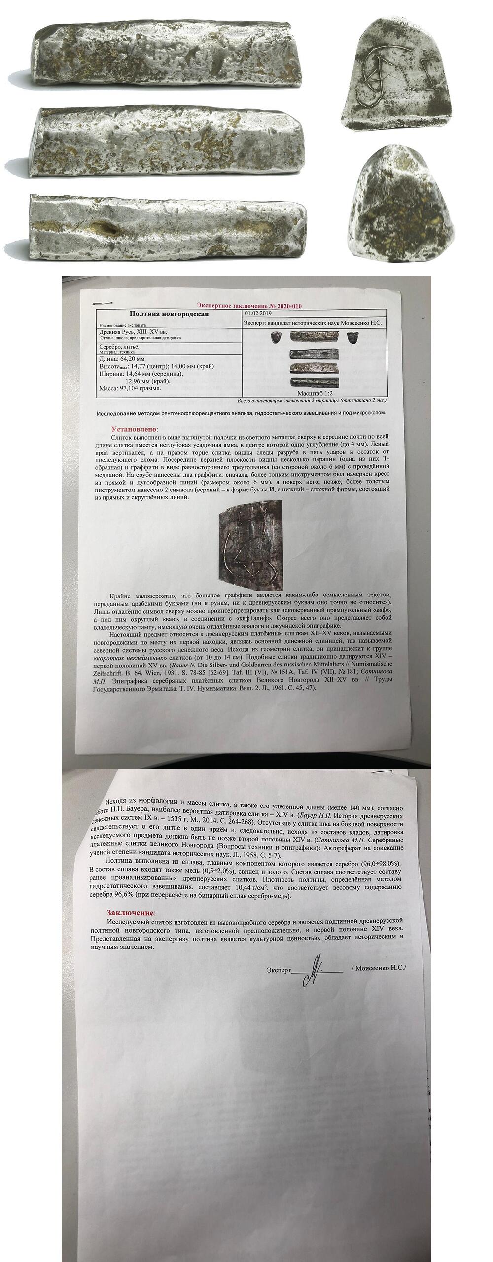 Серебро. 97,1г. Длина 64,20 мм. Ширина 14,64 мм (середина), 12,96 мм (край). Высота 14,00 мм (край), 14,77 мм (середина). На срубе нанесены граффити - вероятно, владельческая тамга. С экспертным заключением кандидата исторических наук Н.С. Моисеенко.