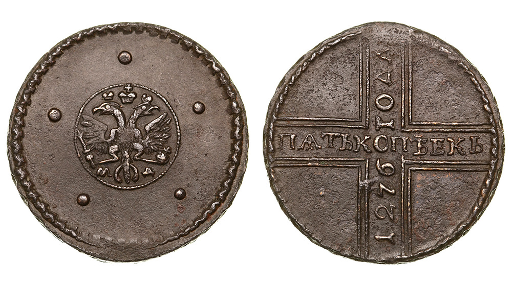 Редкая. Кадашевский монетный двор. Высокая степень сохранности для данного типа монет. Тёмно-коричневая патина. Реверс: дата "1276" вместо "1726". Биткин R2, №255, стр.418. Отсутствует у Узденикова. Ильин - 5 рублей.