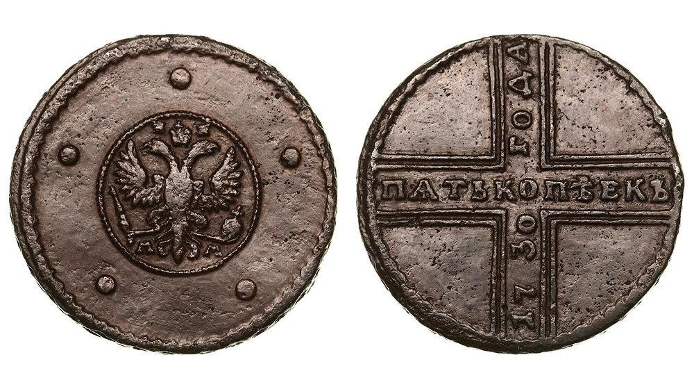 Очень редкая. Аверс: хвост орла широкий. Биткин R3, №259 стр.509, Уздеников №2478 (редкость - "точка"). Ильин, Петров - не описана. Согласно архиву сайта "M-DV", проходов аналогичных монет на аукционах не зафиксировано.
