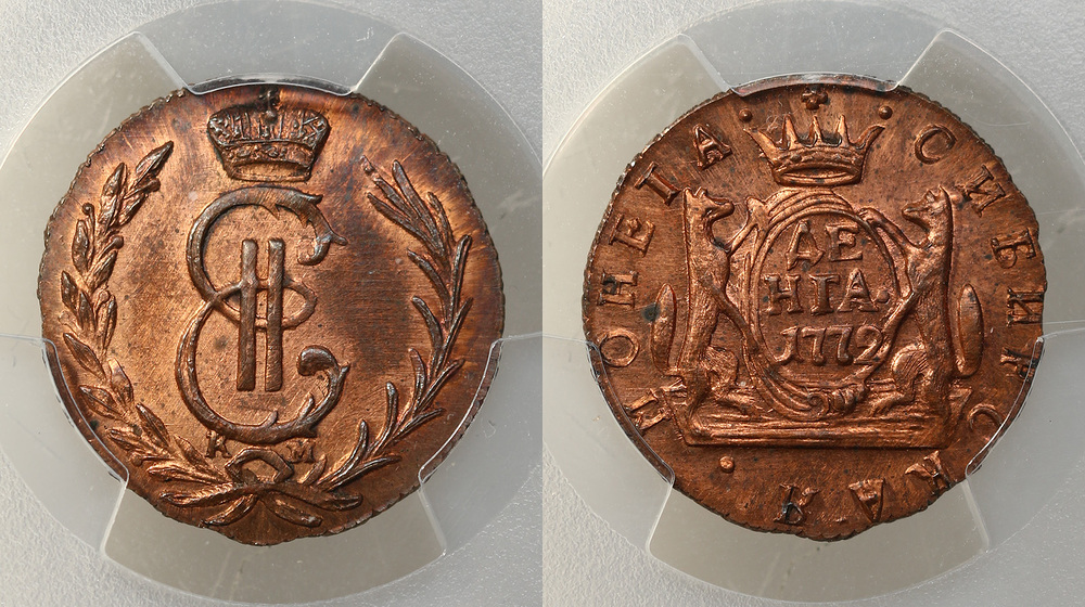 Россия. Сибирь. Деньга 1772 года. КМ. Новодел. SP64 RB.
