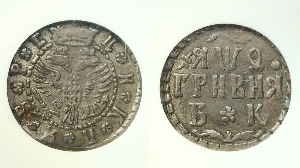 Россия. Гривна 1709 года. БК. AU55.