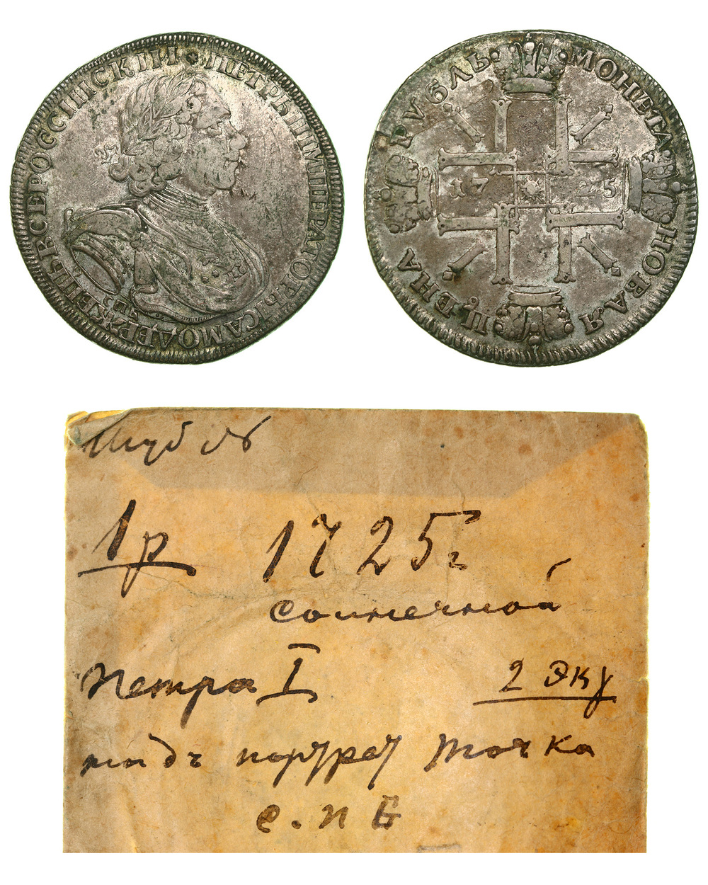 Редкий. Санкт-Петербургский монетный двор, Биткин редкость - R, №1354 стр.159, "Портрет в латах. С пряжкой на плаще, СПБ под портретом, над головой 6-лучевая звезда", Уздеников №0626, Петров - 5 рублей. Дьяков № 1565 (R1), Монета находилась в старом владельческом бумажном пакетике с рукописными пометками.
