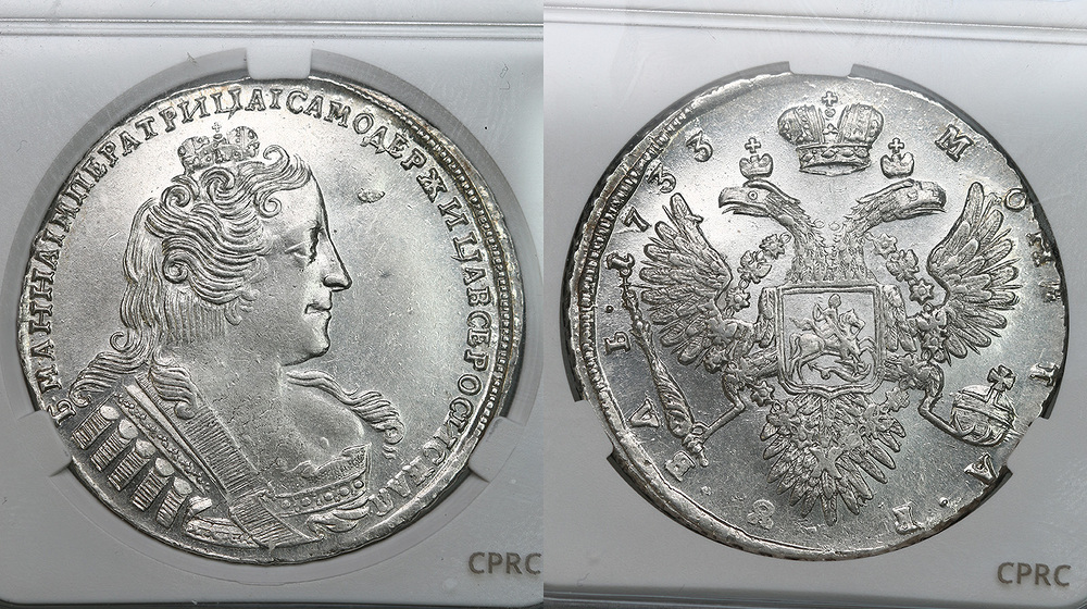 Яркий штемпельный блеск. Без броши на груди / крест державы простой. Биткин - не описана. Уздеников №0706, Петров - 2,25 рубля. В слабе CPRC MS62.