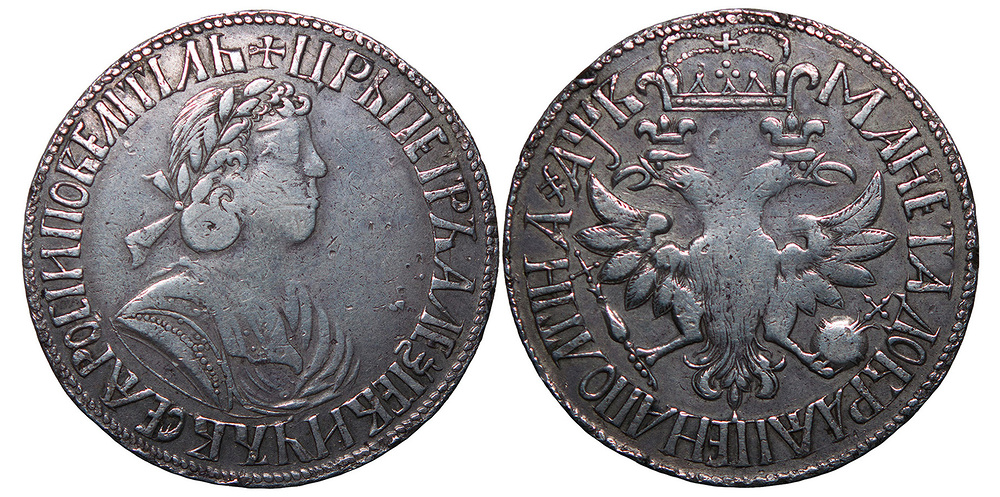 Чрезвычайно редкая. Кадашевский монетный двор. Аверс: маленькая голова; венок с лентой; крест над головой, "ПОВЕЛIТIЛЬ". Светло-серая патина. Биткин R2, №511, стр. 64, Уздеников №0441 (редкость - "точка с чертой"). Петров - 40 рублей.