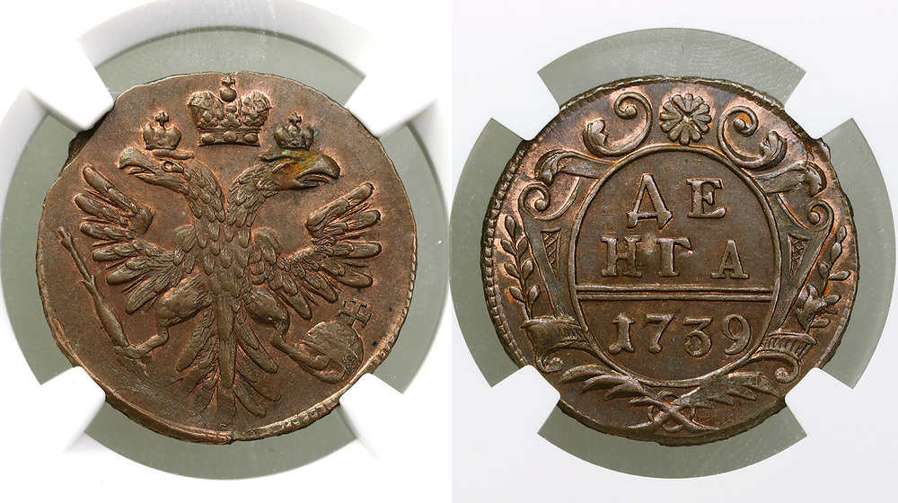 Россия. Деньга 1739 года. Новодел. MS64 BN.