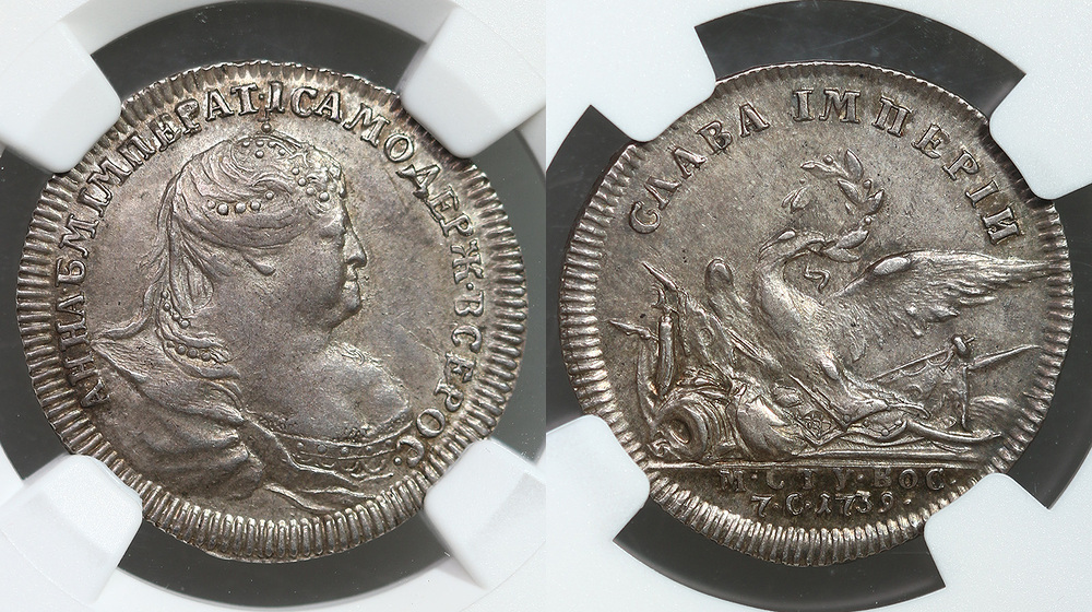 Серебро. "В память заключения мира с Турцией". Санкт-Петербургский монетный двор. Диаметр 22,0 мм. Руденко 1739.2. Дьяков 81.5(R1). Биткин №Ж418, стр.512. В слабе NGC AU58.