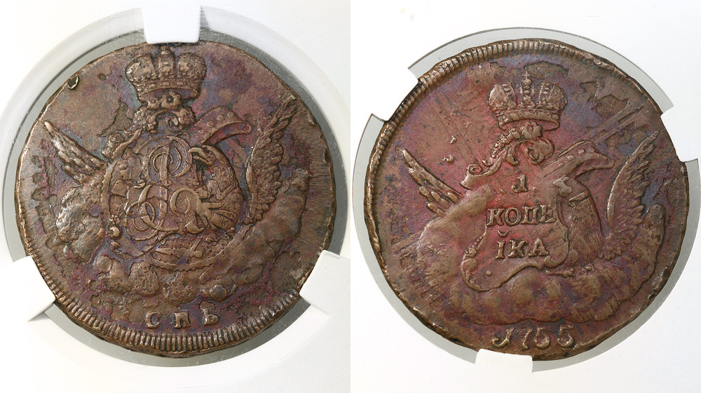 Россия. 1 копейка 1755 года. СПБ. AU50 BN.