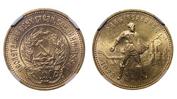 Петроградский монетный двор. Гурт надпись. Золото. Федорин VI #1. Адрианов #1 (P2). Монета в слабе NGC старого образца, MS63. Довольно редкая и важная монета. Насыщенный штемпельный блеск. Прекрасный отборный экземпляр. 2 декабря 1935 года, обычный день на Ленинградском монетном дворе. За верстаком, как обычно, работал седой усатый старик. Глаз верен и рука тверда, но 77 лет – не шутка. Всё чаще старик уставал. Вот и сейчас, тяжело опёршись ладонью на верстак, он тихо вздохнул, опустился в кресло рядом, на минутку передохнуть, и… умер. Прямо на рабочем месте. Это был академик медальерного искусства Антон Васютинский. Ушла эпоха… Несомненно, Антон Фёдорович Васютинский (1858-1935) в прямом смысле слова определил лицо эпохи последнего Российского Императора в монетах и медалях. Из-под резца замечательного гравера вышли все типы портретов Николая II на золотых и серебряных номиналах, роскошная свадебная медаль императорской четы (1894) и в память коронации (1896), ряд юбилейных медалей, аверсы рублей «В память 100-летия Отечественной войны 1812 года» (1912) и «300-летие Дома Романовых» (1913). Уровень проработки анфасных портретов восхищает, а ведь это намного сложнее, чем профильный вариант. Кстати, замечательные образы, подаваемые в анфас, мастер создавал и до, и после памятного рубля 1913 года: Н. И. Лобачевский (1895), П. А. Столыпин (1911). Когда случилась революция… Падение режима открыло новую веху в судьбе бывшего царского медальера. Совсем недолго, с 1918 по 1920, мастер работал на дому. Однако специалисты подобного уровня на вес золота при любом режиме. В 1920 году Васютинский назначен помощником управляющего Медальной и вспомогательной частями Петроградского монетного двора. Между тем советской власти понадобилась своя монета… Естественно, медальер старой закалки, автор всех монетных портретов сверженного императора, ещё толком не знал, что нынешней власти нужно? С гербовой стороной понятно, а что помещать на обороте? Идеи буксовали, время поджимало. В итоге бывалый мастер поступил очень прямолинейно: «расчленил» обрамленное венком центральное поле огромной звездой. Чтобы как-то сгладить некоторую одиозность пятиконечного монолита, вычертил кругом его сердцевину, вставив туда «единицу в полосочку». И на свет появился советский рубль 1921 года. Но что дальше? Других «новых» идей пока не приходило… Иван Иванов из Шадринска, посвятив себя искусству ваяния, решил взять громкий псевдоним, просто сократив название родного города. Так в 1908 году появился Иван Дмитриевич Шадр (1887-1941). В смутное время 1918-го судьба забросила его в далёкий Омск, где талантливый скульптор за 18000 посуленных рублей принялся работать над памятником Лавру Корнилову. Попутно готовил проекты коронации адмирала Колчака и памятника «В честь освобождения Сибири» белой армией. Также правительство Колчака поручило Шадру разработать эскизы денежных знаков серии «Возрождение России». На его счастье, ни один из белогвардейских проектов не был реализован. В апреле 1919-го Омск заняли части Красной Армии. И уже в следующем году Шадр исполнил «правильный» заказ от Сибревкома, изваяв статую Карла Маркса. За короткое время «неудавшийся колчаковец» Иван Шадр превратился не просто в классика соцреализма в скульптуре, он стал одним из его основателей, причём в самом диком проявлении. Достаточно не к ночи помянуть е