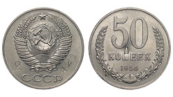 Ленинградский монетный двор. На аверсе размер герба больше. Гурт гладкий. Медно-никелевый сплав, 9,87 г. Ушаков, Федорин# 412 (Р-1), Федорин VI# 2. Сохранность близкая к превосходной превосходная, приглушенный штемпельный блеск. Довольно редкая и важная монета.