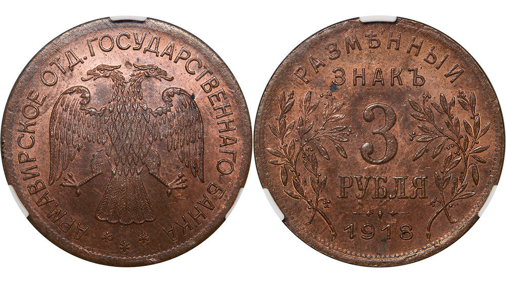 Первый выпуск. Кружок большого формата. Буквы «JЗ» под хвостом орла. Гурт рубчатый. Медь. Brekke #2 (черта). Биткин #2 (R1). Федорин VI, Приложение 3, #02-РДЗ. Монета в слабе CPRC, MS64 RB. Редкая и интересная монета в великолепном состоянии. Естественный красно-коричневый цвет меди, штемпельный блеск. Среди многочисленных денежных выпусков времён Гражданской войны эмиссия Армавирского отделения Государственного банка стоит особо – в Армавире сумели организовать чеканку монет. Сначала их предполагалось отливать, но выглядели они слишком неказистыми, тогда на том же заводе «Армалит» была организована чеканка. Штемпели изготовил австрийский военнопленный гравёр Иосиф Задлер. Его подпись стоит на лицевой стороне всех монет. Монетный двор был оборудован в бывшей усадьбе купца Баранова. Сырьё для производства получали в результате переплавки медных браков, труб и посуды, обнаруженных на винокуренном заводе. За недолгое время работы было изготовлено 2 выпуска монет. Всего было отчеканено монет на сумму около 60000 рублей.