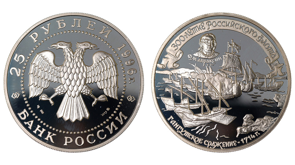 Серебро. 5,0 oz. 0,900. 173,29 г. "300-летие Российского флота. Гангутское сражение". Тираж 3000 шт. В оригинальной капсуле.