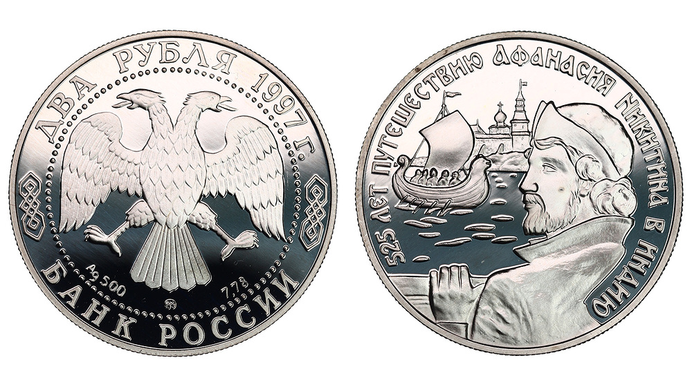 Серебро. 0,25 oz. 0,500. 15,55 г. "525 лет путешествию Афанасия Никитина в Индию /портрет и корабль". Y# 558. В оригинальной капсуле.
