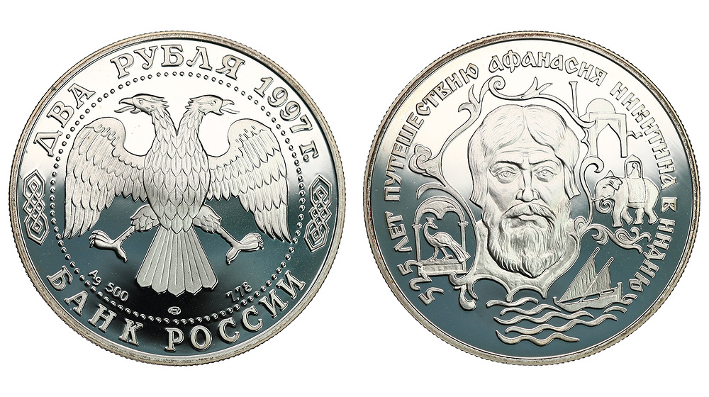 Серебро. 0,25 oz. 0,500. 15,55 г. "525 лет путешествию Афанасия Никитина в Индию /портрет и животные". Y# 559. В оригинальной капсуле.