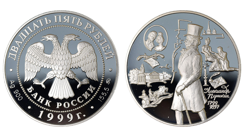 Серебро. 5,0 oz. 0,900. 173,29 г. "Александр Пушкин". Тираж 3000 шт. В оригинальной капсуле.