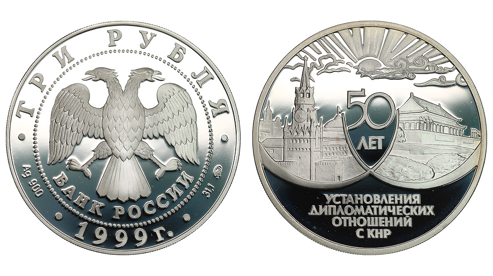 Серебро. 1,0 oz. 0,900. 34,88 г. "50 лет установления дипломатических отношений с КНР". В оригинальной капсуле.