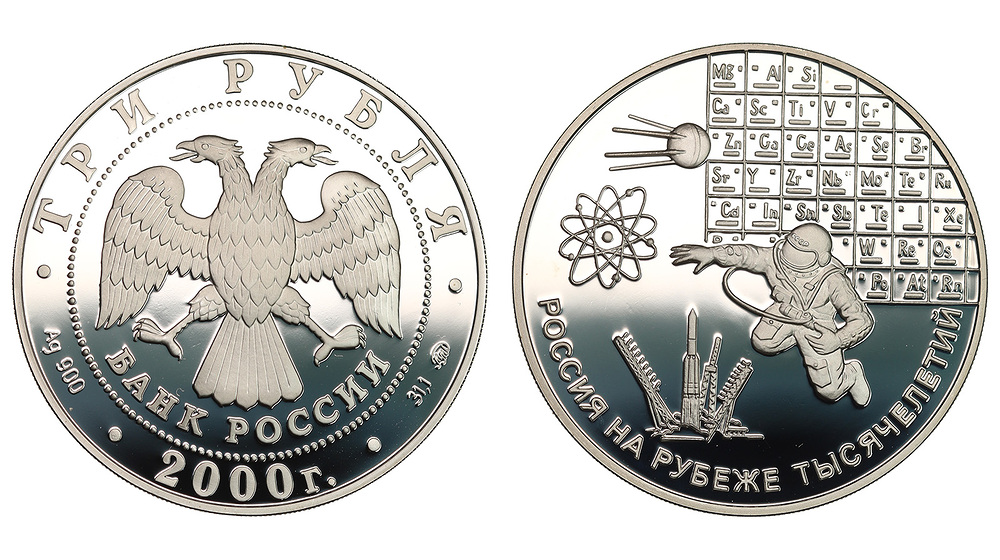 Серебро. 1,0 oz. 0,900. 34,88 г. "Россия на рубеже тысячилетий. Наука". В оригинальной капсуле.