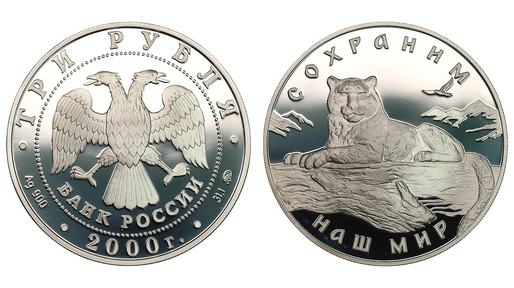 Серебро. 1,0 oz. 0,900. 34,88 г. "Сохраним наш мир. Снежный барс". В оригинальной капсуле.