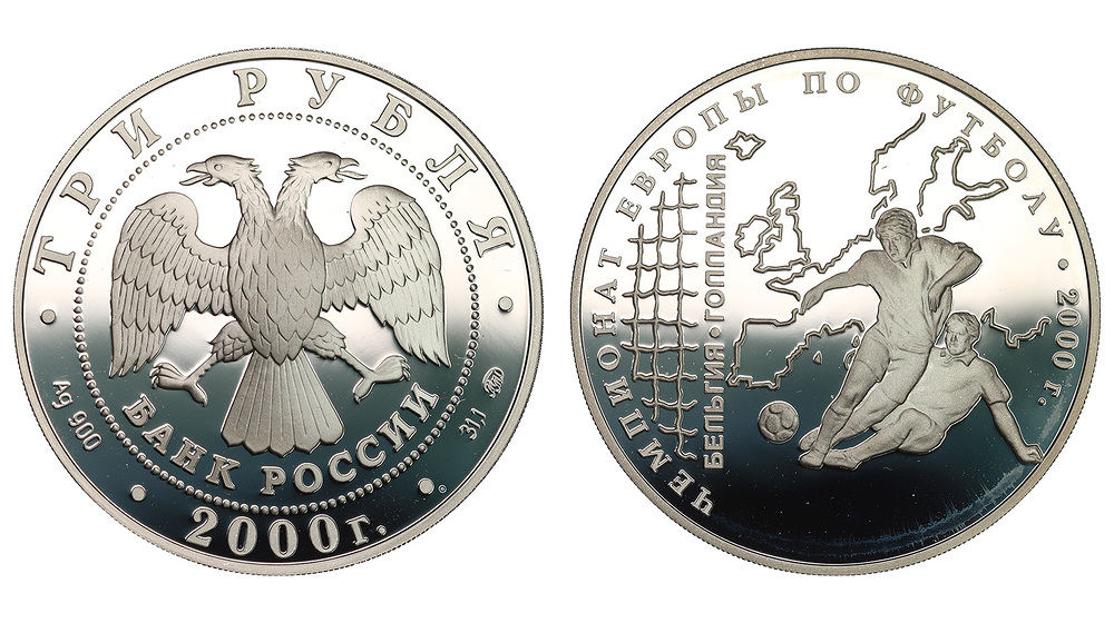 Серебро. 1,0 oz. 0,900. 34,88 г. "Чемпионат Европы по футболу. 2000 г. Бельгия-Голландия". В оригинальной капсуле.