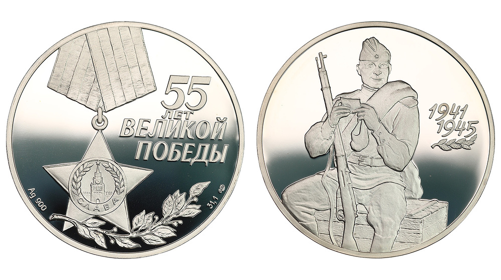 Серебро. 1,0 oz. 0,900. 34,88 г. "55-я годовщина Победы в Великой Отечественной войне 1941-1945 гг". В оригинальной капсуле.