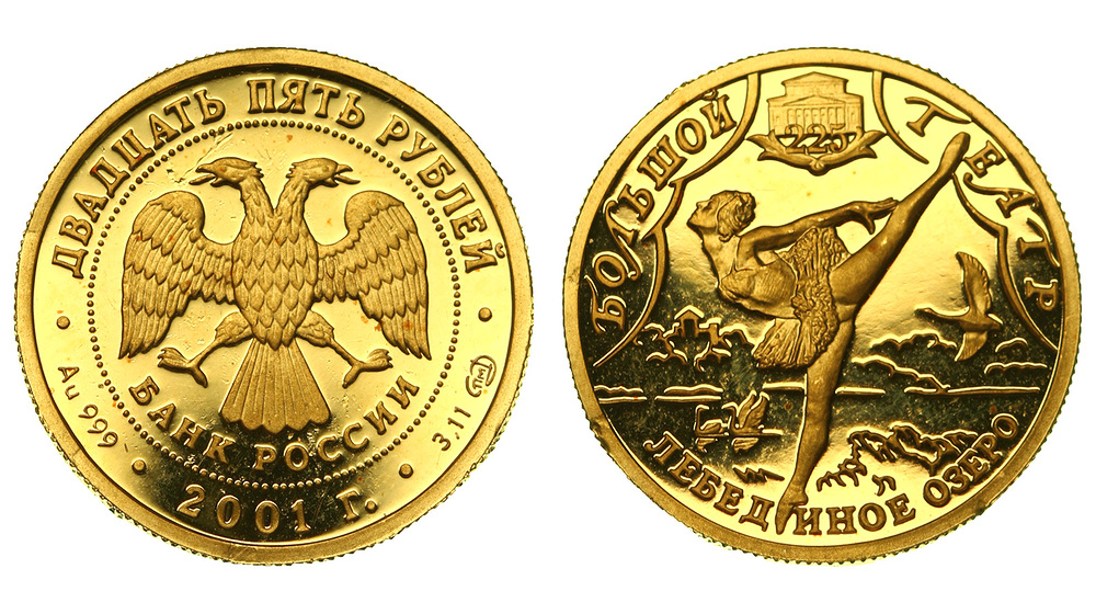 Золото. 0,1 oz. 0,999. 3,11 г. "Большой театр. Лебединое озеро." Следы механики на аверсе.
