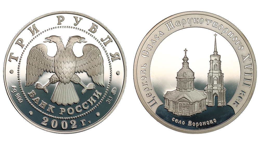 Серебро. 1,0 oz. 0,900. 34,88 г. "Церковь Спаса Нерукотворного (XVIII в.), село Вороново". В оригинальной капсуле.